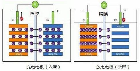 在電場(chǎng)的驅(qū)動(dòng)下鋰離子從正極晶格中脫出,經(jīng)過電解質(zhì),嵌入到負(fù)極晶格中。