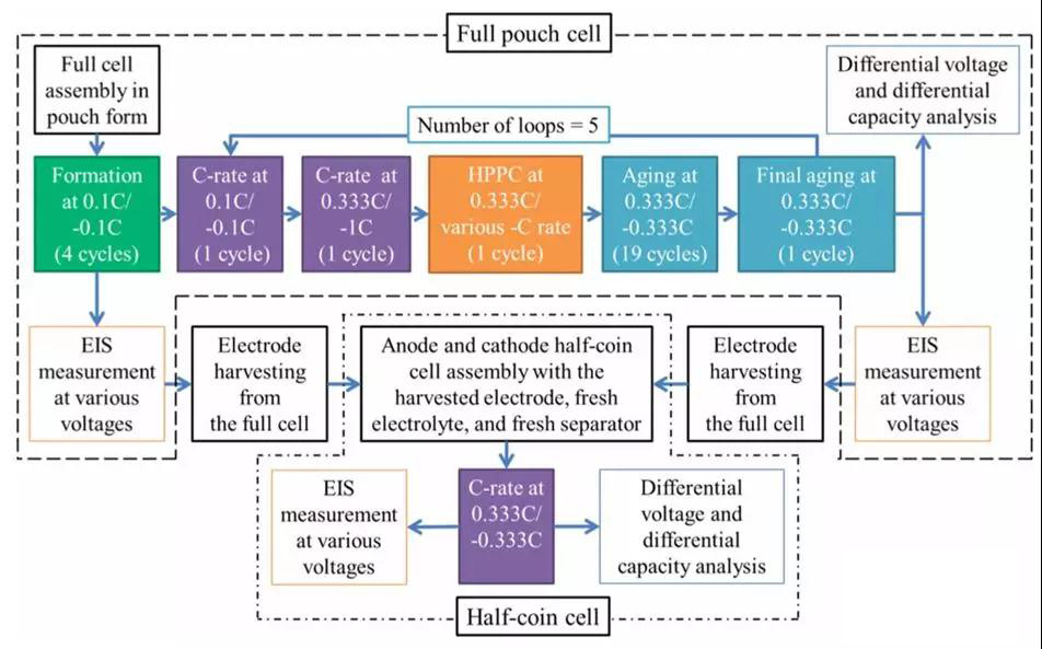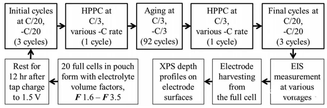 實驗結(jié)果證明,要想獲得具有最佳的循環(huán)性能以及低阻抗的電池,需要的最小電解質(zhì)體積因子為電池組件(正極,負(fù)極和隔板)的總孔體積的1.9倍。過少的電解質(zhì)會導(dǎo)致測量時歐姆電阻增加。 相對于初始值,在100次循環(huán)后,正極處的電荷轉(zhuǎn)移和鈍化層的電阻增加1.5-2.0倍,電荷轉(zhuǎn)移的電阻比鈍化層高2-3倍。 差分電壓分析表明,當(dāng)電池循環(huán)放電后,負(fù)極放電后脫鋰量減少。但注入過量電解液后對電池的循環(huán)穩(wěn)定性并沒有明顯的提升,還原阻抗反而進(jìn)一步增加。