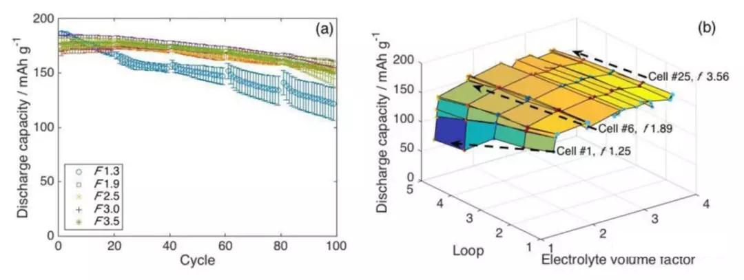 圖2.電解質(zhì)體積和電池循環(huán)性的相關(guān)性(a)對于不同的電解質(zhì)體積因子組,F(xiàn)的放電容量在0.33C / -0.33C下循環(huán);(b)在每個“循環(huán)”之后的單個電池電解質(zhì)體積因子f,其中每個循環(huán)對應(yīng)于20個0.33C / -0.33C老化循環(huán)。