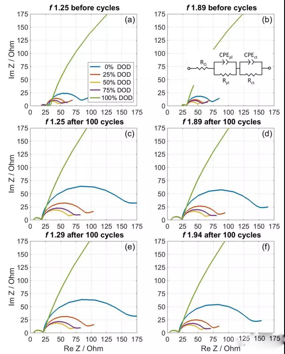 圖3. (a-b)循環(huán)前軟包電池的NMC陰極半電池的EIS數(shù)據(jù),電解質(zhì)體積因子為f 1.25 (a)和f 1.89(b) 。(c-f)100個循環(huán)后軟包電池的NMC陰極半細(xì)胞的EIS數(shù)據(jù)f 1.25(c),f 1.89(d),f 1.29(e)和f 1.94(f)。