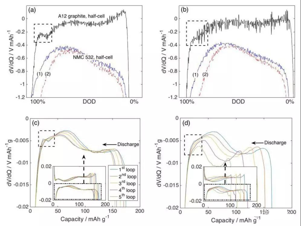 圖5. 來自于軟包全電池中半電池的差分電壓曲線,f 1.94(a),f 1.29(b),來自于軟包全電池的差分電壓曲線f 1.94(c),f 1.29(d)。(1)和(2)分別是老化循環(huán)前后的正極曲線