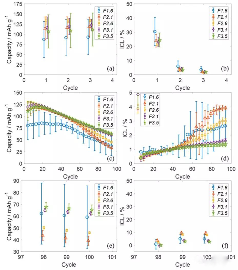 圖2. 電解液注液量與電池循環(huán)能力的相關(guān)性。(a)在0.05C/ -0.05C的前三個循環(huán)期間的放電容量,(c)在0.333C/ -0.333C下老化循環(huán)的放電容量,(e)對于不同的電解質(zhì)體積因子組F,在0.05C/ -0.05C下最后三個循環(huán); 相應(yīng)的不可逆損失在(b)前三個循環(huán),(d)老化循環(huán)和(f)最后三個循環(huán)期間的容量損失(ICL)。