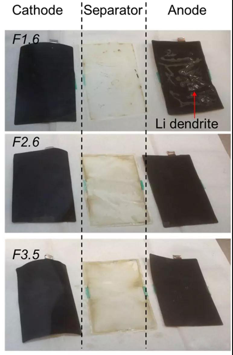 圖3. F1.6, F2.6和 F3.5循環(huán)100次后的正負(fù)極及隔膜圖片。