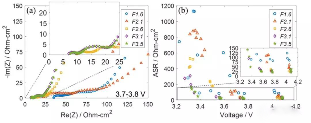 圖4. (a)具有不同電解質(zhì)體積因子組的電池100次循環(huán)后,在3.75V附近的15wt%Si-石墨/ NMC532電池的阻抗譜。 (b)不同電壓下EIS的總電阻。