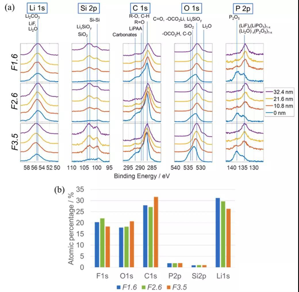 圖5. (a)XPS從F1.6,F(xiàn)2.6和F3.5的深度剖面峰值和(b)來自XPS調(diào)查掃描的頂面(濺射前)的原子百分比。 基于SiO 2的濺射速率計算深度。