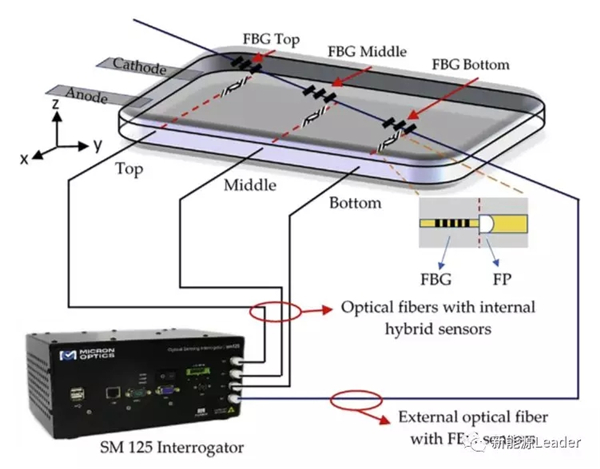 一、內部植入。我們可以在鋰離子電池內部置入熱電偶,實時跟蹤熱失控中鋰離子電池內部溫度變化,我們也可以通過在鋰離子電池內部置入FBG纖維檢測器的方式對鋰離子電池在熱失控中的溫度和壓力變化進行跟蹤分析,這也是目前應用比較廣泛的方式。