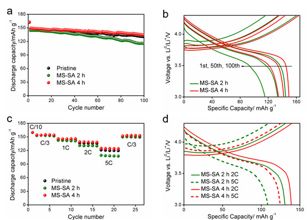 經過4小時的熔融鹽補鋰反應,再生材料的容量,循環性能和倍率性能都完全恢復至原始材料具有的性能(圖6)。而2小時的補鋰反應時間較短,反應并未完全,所以各個指標都低于原始材料。