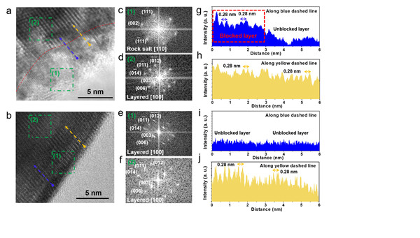圖4 衰減后(a, c, d,g, h)和再生后 (b, e, f, i, j)的NCM523正極材料的高分辨TEM/FFT圖像及強度曲線