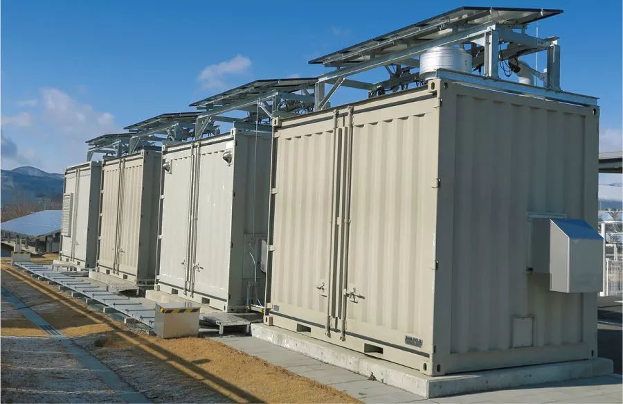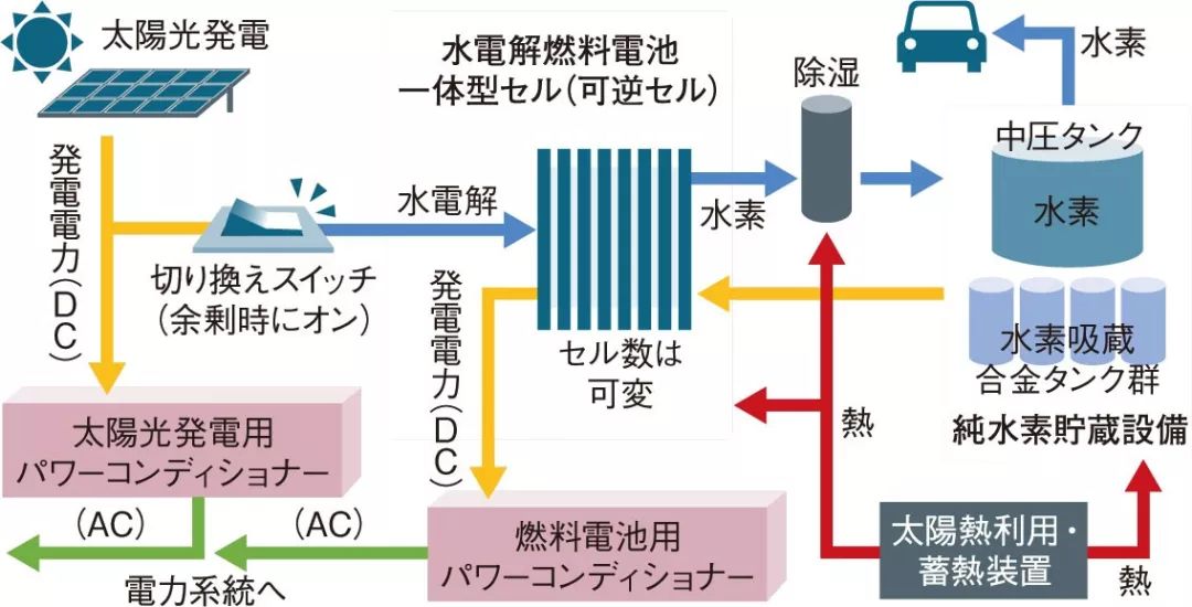 在福島可再生能源研究中心運行的水電解燃料電池集成型電池及其外圍系統(a)。當太陽能發電對于電力系統出現過剩時,從電網互連切換到水電解產生氫氣并將其存儲在罐中。另一方面,當電力系統的電力趨于不足時,儲存的氫氣用于燃料電池中以發電并連接到系統。此外還獨立進行了儲氫合金的研究(b)。使用時的問題之一是切換水電解和燃料電池模式需要花費大約10~30分鐘,時間較長。