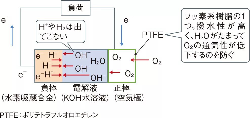 在該電池中,氫并不包含在MH分子(H2)的形式中。此外,由于電解質溶液是堿性的,在H+試圖從MH離開的瞬間,就會遇到OH-離子變成水。