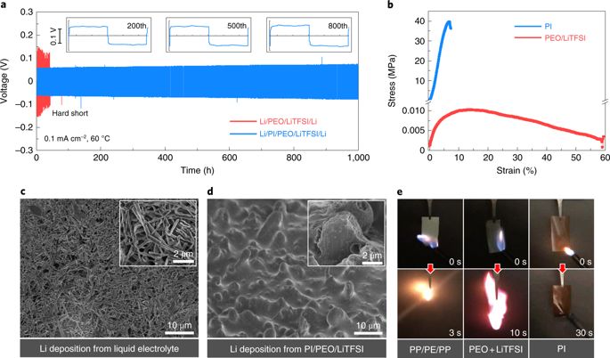 圖4. PI/PEO/LiTFSI力學測試和耐火測試