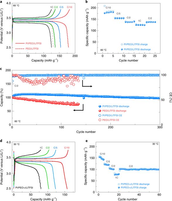 全固態電池中超薄超輕的PI / PEO / LiTFSI(1.12 mg cm-2)具有與隔膜/液體電解質(1 mg cm-2)相似的面積密度,確保其優于其他固體電解質系統。由于全固態LIB的電池外殼可能比液體電解質LIB更簡單,所以固體聚合物-聚合物復合材料LIB的能量密度可能會更高。進一步,通過高容量鋰化學,例如硫和金屬鋰,可以實現更高的能量密度。