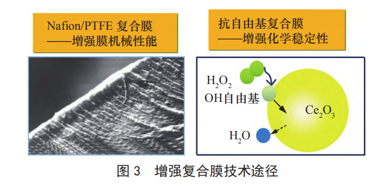 從圖1可見,提高性能除了要通過提高催化劑活性降低活化極化外,隨著電流增大,伏安曲線直線段的斜率主要是歐姆極化決定的,其中膜的歐姆極化占有主要份額。為了提高性能,目前車用質子交換所用的膜逐漸趨于薄型化,由幾十微米降低到十幾微米或以下,以降低質子傳遞的歐姆極化,獲得較高的性能。但是薄膜在車載運行工況下(如操作壓力、干濕度、溫度等操作條件的動態變化)更容易受到機械損傷與化學降解。復合膜是由均質膜改性而來的,它利用均質膜的樹脂與有機或無機物復合使其比均質膜在某些功能方面得到強化。因此,增強復合薄膜是解決薄膜應用的主要解決方案。增強復合膜既保證了薄膜的性能又使其機械強度及化學耐久性得到強化,其實現的技術途徑一是機械增強;二是化學增強(見圖3)。