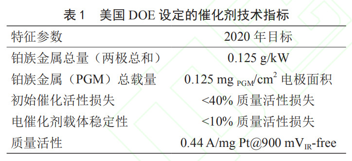 從燃料電池極化曲線可以看出,提高燃料電池性能首先要降低活化極化,而活化極化主要與催化劑活性密切相關。燃料電池在反應過程中,由于氧還原反應(ORR)的交換電流密度遠低于氫氧化反應(HOR),一般極化損失主要來自于陰極側(空氣側)。因此,研究焦點是提高陰極側催化劑的活性。目前,質子交換膜燃料電池中常用的商用催化劑是鉑炭催化劑(Pt/C),是由 Pt 的納米顆粒分散到碳粉(如 XC-72)載體上的擔載型催化劑,實際使用測試發現這種商用催化劑在活性、穩定性等方面都存在一定不足。美國能源部(DOE)催化劑指標如表1所示,研究者通過Pt晶面控制、Pt-M合金催化劑、Pt-M核殼催化劑、Pt表面修飾、Pt單原子層催化劑等多種途徑探索高活性、高穩定性催化劑的解決方案,在這些研究中目前可以實際應用的只有Pt-M合金催化劑。