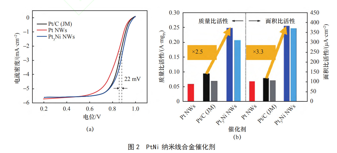 Pt-M催化劑是Pt與過渡金屬形成的合金催化劑,通過過渡金屬催化劑對Pt的電子與幾何效應,在提高穩定性的同時,質量比活性也有所提高;同時,降低了貴金屬的用量,使催化劑成本也得到大幅度降低。 如Pt-Co/C、Pt-Fe/C、Pt-Ni/C等二元合金催化劑,展示出了較好的活性與穩定性。Chen 等人利用鉑鎳合金納米晶體的結構變化,制備了高活性與高穩定性 Pt3Ni 納米籠催化劑,其質量比活性與面積比活性分別提高36倍與22倍。在Pt合金催化劑應用方面,豐田汽車公司披露了在所發布的商業化燃料電池車Mirai上就是采用了Pt-Co合金催化劑,使其催化劑活性提高了1.8倍。中國科學院大連化學物理研究所(大連化物所)開發的Pt3Pd/C催化劑已經在燃料電池電堆得到了驗證,其性能可以完全替代商品化催化劑;此外,大連化物所還研制出了超小PtCu合金催化劑,其質量比活性是目前Pt/C的3.8倍;PtNi 納米線合金催化劑質量與面積比活性分別達到Pt/C的2.5倍和 3.3 倍(見圖2),展示了較好的應用前景。