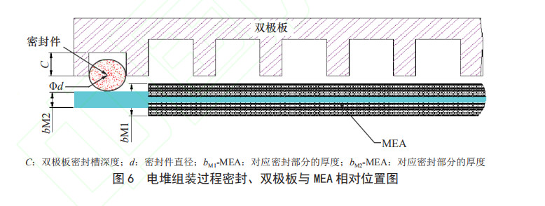 電堆組裝過程通常是在壓力機上進行的,一般是依據一定的組裝順序及定位方法,把MEA與雙極板摞裝起來并附以集流板、端板,通過緊固裝置固定形成一個完整的電堆。電堆組裝除了要保證電堆密封性外,還要保證 MEA 與雙極板界面的良好接觸。電堆設計階段要考慮電堆密封元件形變與MEA 形變的匹配,在組裝過程中通過控制電堆高度定量雙極板向膜電極擴散層中嵌入深度,并同時使密封元件達到預定的變形量。圖6為電堆組裝過程密封件、雙極板與 MEA 相對位置圖,電堆組裝高度為h=h1=h2,其中h1為滿足MEA壓深以獲得預期較小接觸電阻的組裝高度;h2為滿足密封變形要求的組裝高度,一般通過離線試驗可以確定獲得較小接觸電阻 MEA 的壓深率 fM 和密封件壓縮率fr,密封件壓縮率fr根據密封結構與材料可在一定范圍內調整(如30%~60%)。