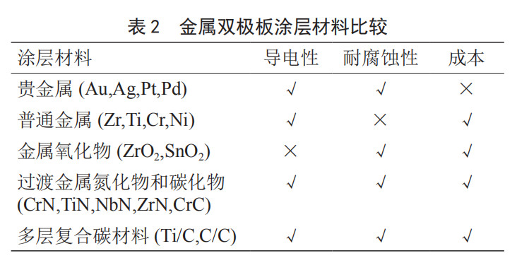 金屬是電與熱的良導體,其作為雙極板材料得到越來越普遍的應用,尤其是車輛空間限制(如乘用車),要求燃料電池具有較高的功率密度。薄金屬雙極板以其可以實現雙極板的薄型化及本征的優良導電特性,成為了提高燃料電池功率密度的首選方案;目前各大汽車公司大都采用金屬雙極板技術,如豐田汽車公司、本田株式會社、現代汽車有限公司等。金屬雙極板技術挑戰是其在燃料電池環境下(酸性、電位、濕熱)具有耐腐蝕性且對燃料電池其他部件與材料的相容無污染性。目前常用的金屬雙極板材料是帶有表面涂層的不銹鋼或鈦材。針對燃料電池不銹鋼雙極板表面耐腐蝕涂層技術,國內外進行了大量的學術研究工作,其涂層材料要保證耐腐蝕、導電兼備性能,代表性的涂層材料如表2所示。總體來說,表面涂層材料可以分為金屬、金屬化合物與碳涂層三類;金屬類包括貴金屬以及金屬化合物。貴金屬涂層,如金、銀、鉑等,盡管成本高,但由于其優越的耐蝕性以及與石墨相似的接觸電阻使其在特殊領域仍有采用。為了降低成本,處理層的厚度盡量減薄,但是要避免針孔。金屬化合物涂層是目前研究較多的表面處理方案,如Ti-N,Cr-N,Cr-C 等表現出較高的應用價值。除了金屬類涂層以外,在金屬雙極板碳類膜方面也有一定探索,如石墨、導電聚合物(聚苯胺、聚吡咯)以及類金剛石等薄膜,豐田汽車公司Ce2O3H2O的專利技術(US2014356764)披露了具有高導電性的 SP2 雜化軌道無定型碳的雙極板表面處理技術。
