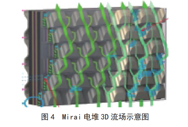 合理的雙極板流場設計與布局,可以起到降低傳質極化作用,有利于提高大電流密度下的性能,進一步提高電堆的功率密度。豐田汽車公司在Mirai 燃料電池車電堆中推出了3D流場新型設計理念(見圖 4),改變了傳統蛇型、平行溝槽型的2D流場構型,使流體有垂直于乙醇胺(MEA)氣體擴散層與催化層的分量,反應物與生成物不是單純依靠濃差擴散到達與脫離反應界面,而是有強制對流作用,極大地改善了燃料電池傳質推動力,性能得到顯著提升。此外,這種3D流場具有一定的儲水功能,有利于燃料電池運行時的濕度調整,可以提高低增濕下燃料電池性能。