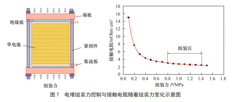 除了用高度控制來獲得電堆最佳組裝匹配外,還可以采用組裝力控制法確定電堆部件之間的良好匹配關系。組裝力可以通過組裝機械如油壓機實施,隨著組裝力加大,雙極板與 MEA 間的接觸逐漸減少,當達到平緩區即為最佳的組裝力控制區(見圖7),通常接觸電阻與組裝力的關系可以在電堆組裝前通過單電池試驗離線獲得,并確定接觸電阻達到較小狀態對應的組裝力。