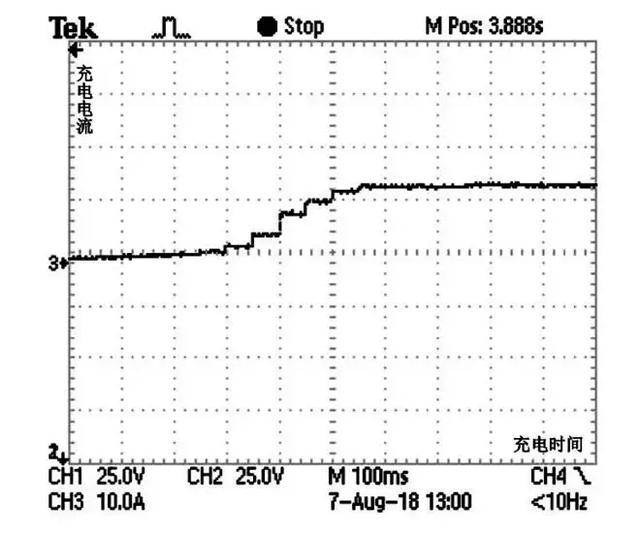 圖2所示為電池起動充電的電流變化曲線,可以看出經(jīng)IGBT器件的控制,電池電流緩慢上升至設(shè)定充電電流,可避免大電流的產(chǎn)生。