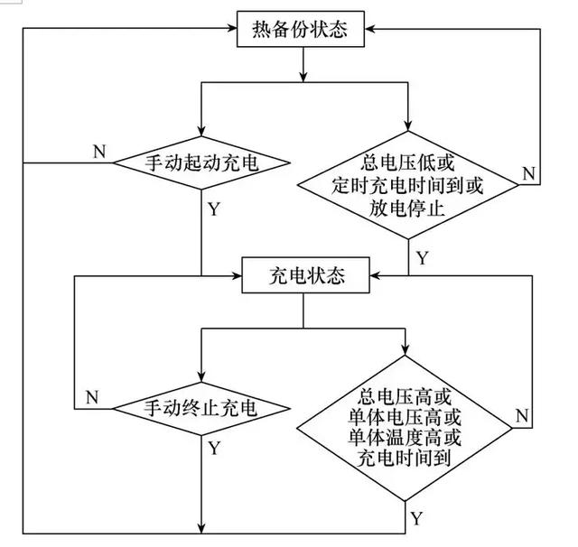 通過IGBT器件控制結(jié)合對電池組數(shù)據(jù)的采集和判斷,控制磷酸鐵鋰電池在充滿電后斷開充電回路,在需要補充充電時自動起動充電,不進行長期在線浮充電,避免過充電對磷酸鐵鋰電池造成損傷,其充電控制狀態(tài)轉(zhuǎn)換如圖3所示。