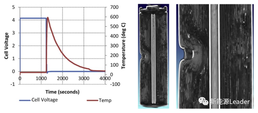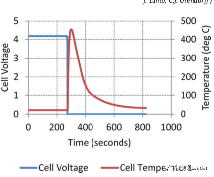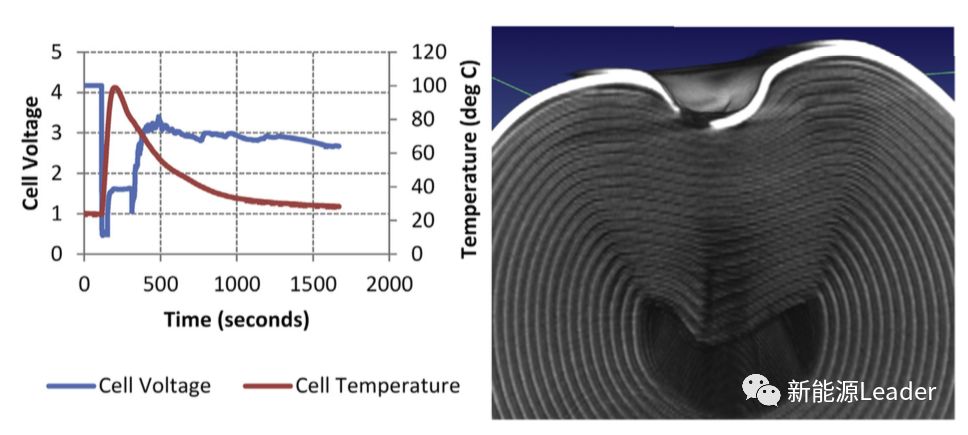 為了驗(yàn)證這種鈍頭細(xì)桿擠壓測(cè)試的效果,作者采用傳統(tǒng)的針刺實(shí)驗(yàn)對(duì)鋰離子電池進(jìn)行了測(cè)試,從圖中能夠看到無(wú)論是電壓變化,還是溫度升高曲線,兩者都非常接近,但是LG電池在針刺測(cè)試中電池的溫度會(huì)更高(662℃),這也表明鋰離子電池在安全測(cè)試中的表現(xiàn)不僅僅與電池選擇的材料體系有關(guān),也與選擇的測(cè)試方法有關(guān)。