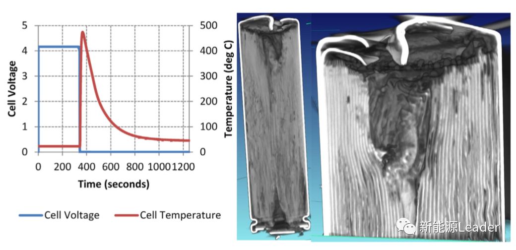 下圖為在垂直方向上對(duì)LG的18650電池進(jìn)行擠壓測(cè)試,從圖中能夠看到在擠壓開(kāi)始的時(shí)候并沒(méi)有對(duì)電池的電壓和溫度產(chǎn)生顯著的影響,直到擠壓的深度達(dá)到了10.7mm,電池突然發(fā)生硬短路,電池電壓突然降低,隨后電池溫度急劇升高,最高達(dá)到470℃,電池發(fā)生熱失控,CT掃描發(fā)現(xiàn)電池內(nèi)部存在Al顆粒,表明熱失控時(shí)電池內(nèi)部的溫度超過(guò)了660℃。