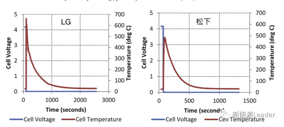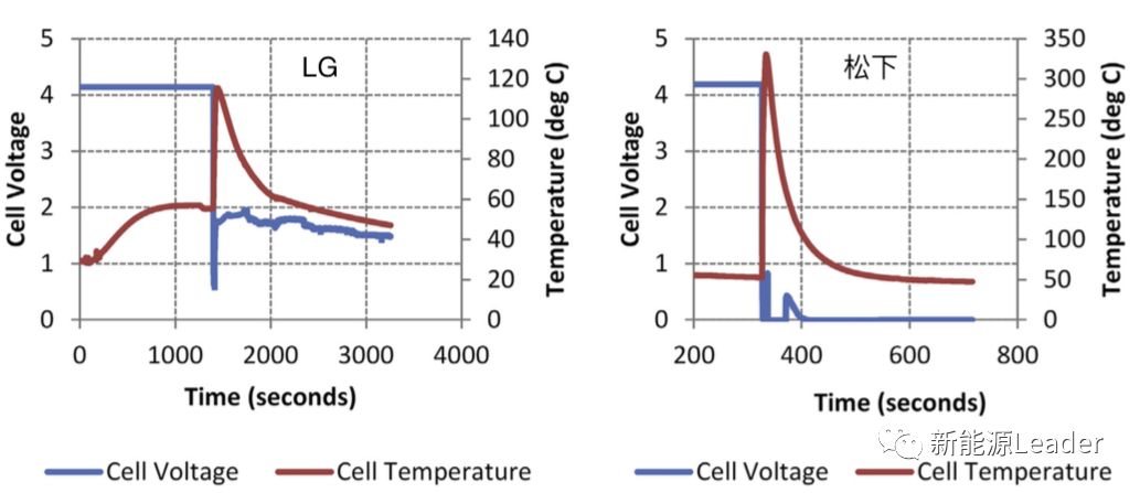 通過(guò)上述在60℃環(huán)境下的鈍頭細(xì)桿擠壓測(cè)試能夠發(fā)現(xiàn),高溫下進(jìn)行測(cè)試的結(jié)果與常溫下進(jìn)行測(cè)試的結(jié)果存在明顯的區(qū)別,對(duì)于LG的電池,高溫使得熱失控的劇烈程度明顯降低,而松下的電池則更快的發(fā)生了內(nèi)短路。