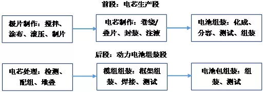 消費領(lǐng)域的數(shù)碼電池是鋰電池行業(yè)發(fā)展最早也最成熟的應(yīng)用產(chǎn)品,其生產(chǎn)工藝及設(shè)備基本標(biāo)準(zhǔn)化。主要由上游電芯生產(chǎn)廠家生產(chǎn),其“電芯”也是構(gòu)成動力電池生產(chǎn)最基本的原料。電芯生產(chǎn)段主要涉及的設(shè)備有: