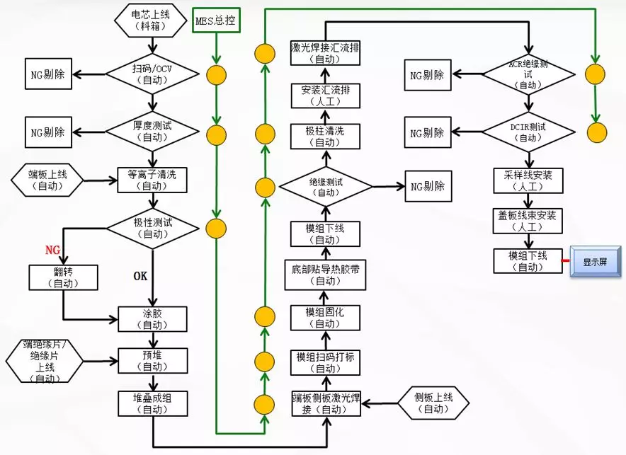 這一序列工序是完成從單個電芯配組成模組的組裝工藝過程,從模組配組成電池包過程也基本類似。也就是說所有的工序、處理動作都是圍繞單個電芯配組成模組再配組成電池包而進行的,如:只有經(jīng)過一序列檢測、處理合格,滿足所謂“同一性”要求的電芯才能參與配組;電芯堆疊與模組框架組裝好,符合成組要求,滿足組裝精度才能進行電芯串并聯(lián)的焊接作業(yè);電芯組裝成模組后合不合格要通過測試才能確定等等。