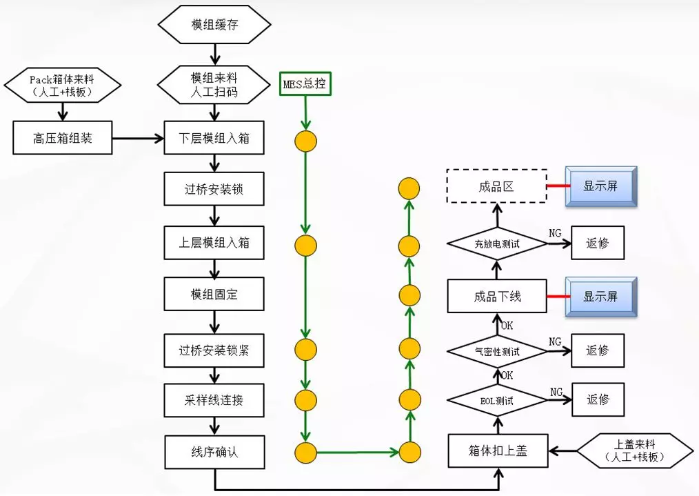 因此,由于電芯及側(cè)板、端板、絕緣片、連接片等投入物料差異;模組及電池包的結(jié)構(gòu)和組裝差異;行業(yè)標(biāo)準(zhǔn)化的缺位等因素,所以設(shè)計時要著重注意產(chǎn)線的兼容性、整線的節(jié)拍,也就是說目前生產(chǎn)線設(shè)計要定位于多規(guī)格小批量混線生產(chǎn)方式。這也從一個角度說明:產(chǎn)線的控制架構(gòu)設(shè)計,數(shù)據(jù)采集和處理方式從技術(shù)層面看是設(shè)計自動化產(chǎn)線控制系統(tǒng)的關(guān)鍵,圍繞MES(制造執(zhí)行系統(tǒng))設(shè)計才是設(shè)計控制系統(tǒng)的指導(dǎo)核心。