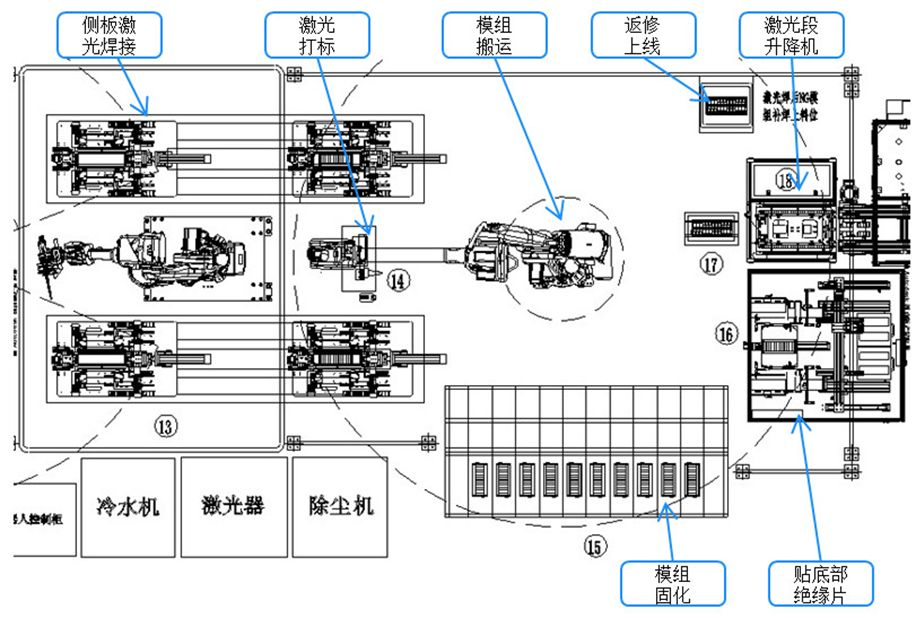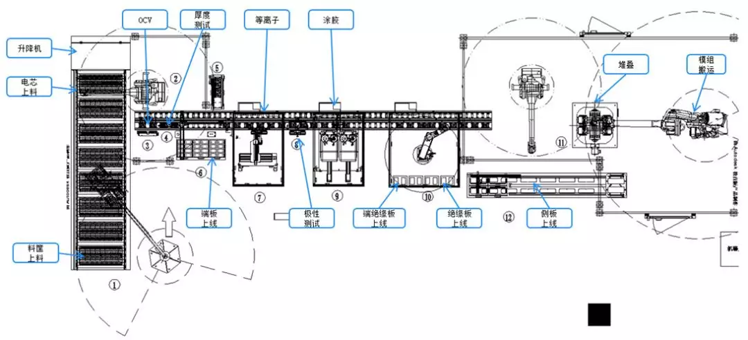 從圖中可見動力電池組裝流程基本是從頭到尾連續(xù)進行的,一般在模組組裝與電池包組裝段之間通過模組緩存庫來連接,也就是說,整個生產(chǎn)過程可以分成兩段流程型自動線。