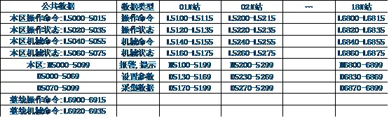 不同區(qū)是通過IP地址來區(qū)分,不同區(qū)的工站模塊結(jié)構(gòu)定義完全相同。上表中應(yīng)用到的L5000-6999,M5000-7999, D5000-8999范圍內(nèi)數(shù)據(jù)區(qū)保留作為控制網(wǎng)絡(luò)、區(qū)間、上位機等之間交換狀態(tài)和數(shù)據(jù)用,設(shè)置參數(shù)、采集數(shù)據(jù)、報警提示具體定義可根據(jù)實際應(yīng)用進一步配置細(xì)化。