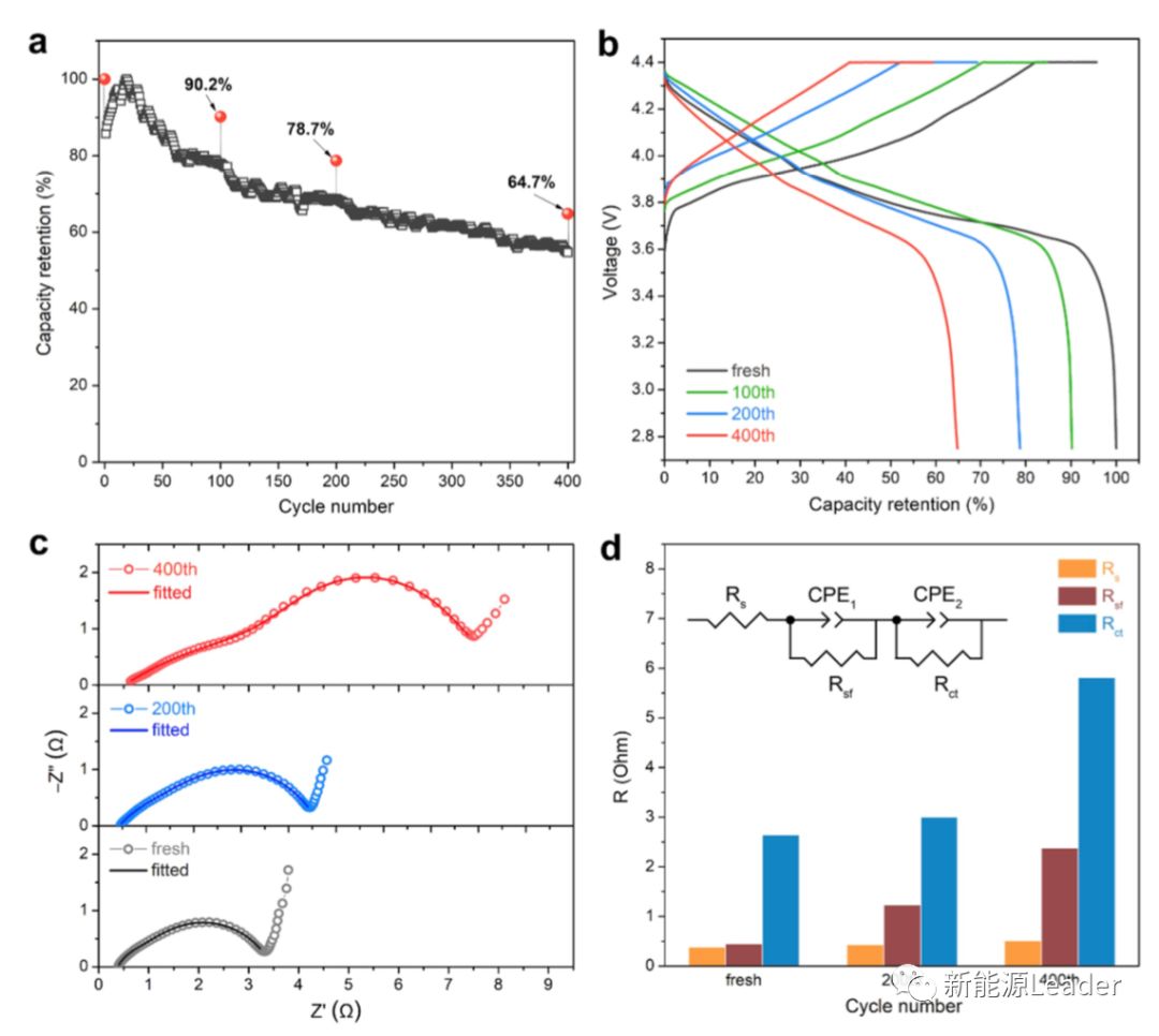 實驗中作者用來獲得SEI膜樣品的33mAh軟包電池正極為Mg摻雜的LCO材料,負極為人造石墨材料,電解液則由三星SDI提供,隔膜則為10um厚度,并具有氧化鋁-聚合物涂層。上述電池首先采用0.5C倍率預充到2.5V,老化一天后進行化成(2.75-4.4V)。為了獲得足夠數量的SEI膜樣品,作者將上述的電池在2.75-4.4V之間的范圍內對電池進行了400次循環(如下圖a所示),電池循環100次、200次和400次后的容量保持率分別為90.2%、78.7%和64.7%。下圖c為電池在循環之前、循環200次和循環400次后EIS測試結果,可以看到電池EIS曲線主要由高頻范圍內一個壓縮的半圓和低頻范圍內的一條擴散曲線構成,對EIS測試結果進行擬合后我們能夠發現,隨著電池循環次數的增加,電池的歐姆阻抗、SEI膜阻抗和電荷交換阻抗都出現了顯著的增加(如下圖d所示)。