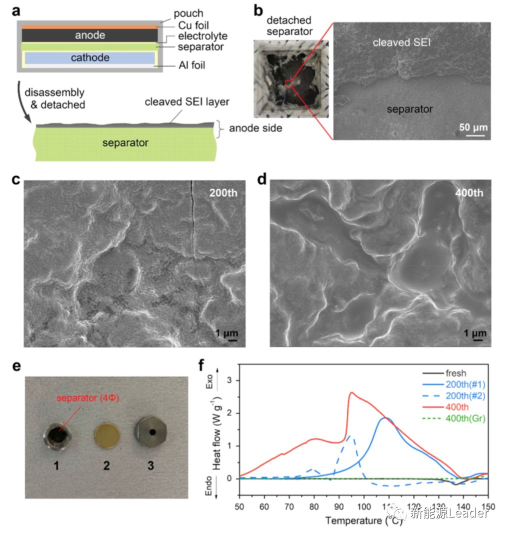 在上述的電池經過循環后,作者對電池進行了解剖,解剖發現隔膜與負極已經完全粘在了一起,將隔膜與負極分離后,隔膜表面會粘下一層SEI膜,通常我們認為這主要是SEI膜的外層結構,主要包含多孔的有機物成分。作者將上述帶有SEI膜的隔膜制成直徑為4mm的樣品進行DSC測試(測試結果如下圖f所示)。從下圖f能夠看到所有的隔膜樣品在140℃附近都出現了一個小的吸熱峰,對應的為隔膜的融化。同時我們注意到循環后的隔膜樣品出現了較為明顯的放熱峰,而沒有循環過的隔膜則未見明顯的放熱峰,因此作者判斷這些隔膜樣品的放熱峰主要來自于隔膜表面粘下的SEI成分的分解反應,對不同隔膜樣品的放熱量測試顯示,循環200次后的隔膜1#和2#樣品的放熱量分別為322.4mJ和81.2mJ,而循環400次后的隔膜樣品的放熱量則達到了751.1mJ,表明循環時間更長的樣品產生的SEI數量也更多。