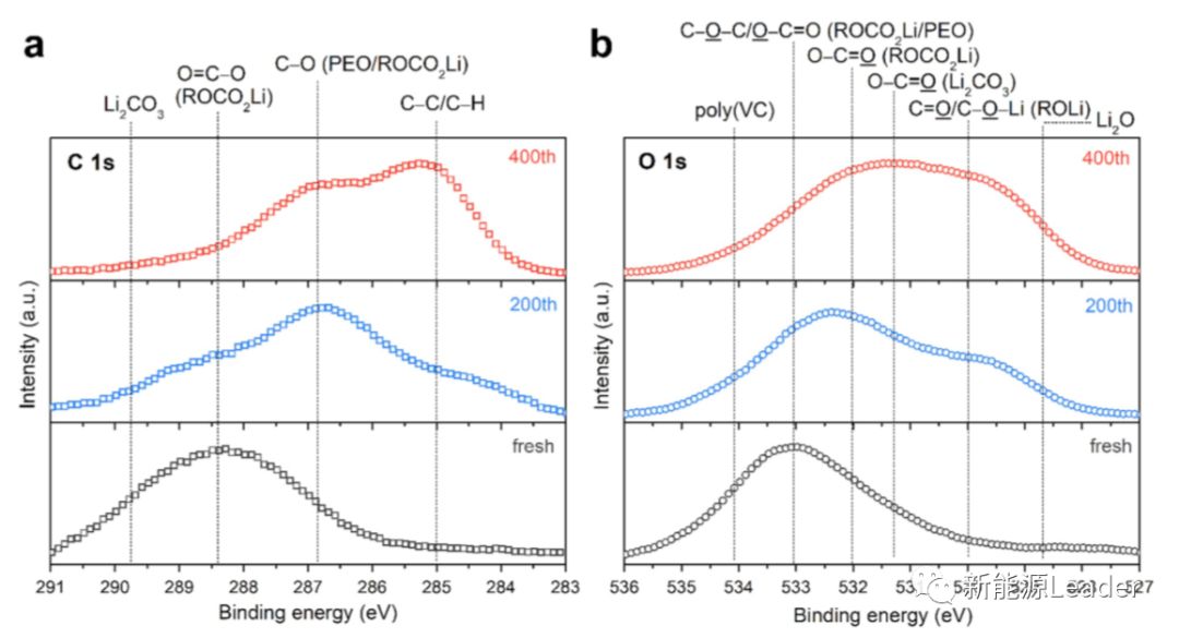 為了分析SEI膜的成分,作者采用XPS對于隔膜上粘下的SEI膜樣品進行了分析(結果如下圖所示),從下圖我們能夠看到沒有循環的樣品上的主要成分為ROCO2Li-,以及一些含O的聚合物成分,例如聚氧化乙烯(PEO),還含有少量的Li2CO3和聚VC。而在循環后的樣品中我們觀察到了相當數量的Li2CO3和ROLi,以及ROCO2Li-、PEO和Li2O等,這表明在循環的過程中部分的ROCO2Li-與電解液中的痕量H2O或CO2氣體反應分解成為了Li2CO3,而SEI膜中少量的Li2O則主要來自于痕量H2O或Li2CO3的分解。