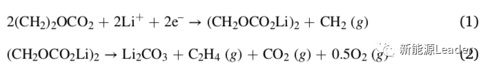 因此,我們在前面的DSC實驗中觀察到的在140℃以下時SEI膜樣品出現的放熱反應主要來自于SEI膜中的有機成分的分解,例如碳酸乙烯酯Li(來自EC溶劑的分解),具體反應如下式所示。