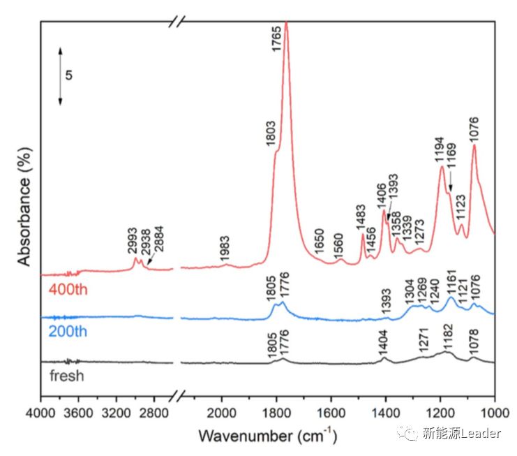 下圖為不同SEI膜樣品的紅外吸收譜,從下圖中我們能夠看到在未循環的樣品中能夠觀察幾個比較微弱的峰,在1776和1805/cm處峰分別為聚碳酸酯中被拉伸的C=O鍵和EC/DMC分解后的含Li產物,在1404/cm的峰為ROCO2Li中的-CH3或-CH2鍵,1271/cm的峰為Li2CO3中的O-C-O鍵能,1182/cm的峰主要來自于LiPF6和EC/DMC的分解產物,1078/cm處的峰則主要是ROCO2Li和Li2CO3中的C-O鍵。在經過200次循環后這些峰都出現了明顯的強度增加,在經過400次循環后這些峰的強度進一步增加,特別是反應ROCO2Li和Li2CO3的峰顯著增強。同時我們在400次循環后的電極中還觀察到了一些新形成的特征峰,例如在1456/cm和1483/cm附近ROLi中的C-H鍵,以及羧酸鋰中的Li-COO鍵,以及ROCO2Li中被拉伸的C=O鍵(1650/cm),以及在-CH3/ROCO2Li/ROLi/聚碳酸酯中的C-H鍵。這一發現表明長期循環后負極表面的SEI膜顯著增厚,其表層含有大量的有機成分,例如聚碳酸酯、ROCO2Li,以及含Li-EC和Li2CO3。