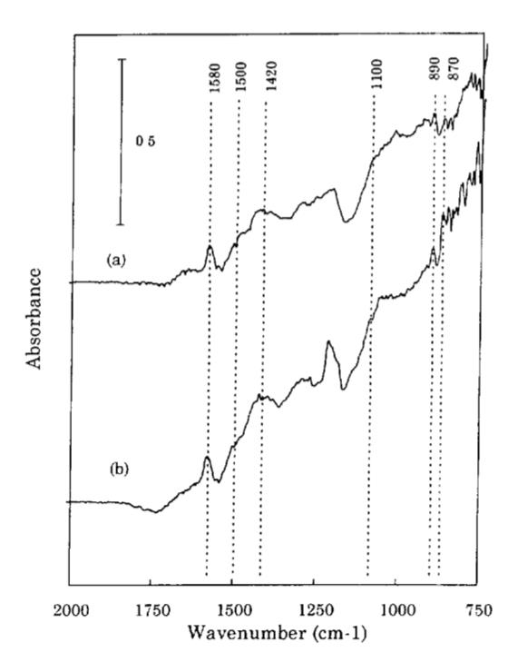 下圖為采用純EC溶劑和EC+DMC溶劑的電解液的電池的負極紅外吸收譜圖,從圖中能夠看到兩個負極表面都出現了Li2CO3(1420、870/cm)和RCOOLi(1580/cm)和(CH2OLi)2(1500、1100和890/cm)的吸收峰,這些產物也在其他含有EC溶劑電解液的負極表面觀察到,這也表明在含有EC溶劑的電解液中,主要是EC溶劑在負極表面發生分解。