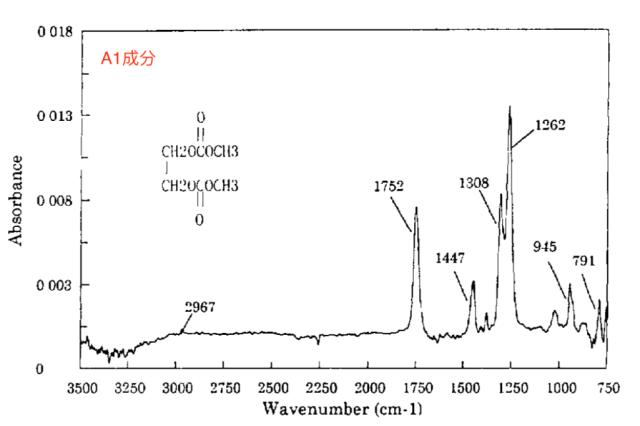 下圖DMC分子和分解產物A1的紅外吸收譜,從下圖中能夠看到DMC與A1產物具有相似的吸收峰,因此不難判斷兩者具有相似的結構,從下圖中作者推斷出的分子結構看,A1產物實際上就是兩個DMC分子結合在一起。同理A2和A3也都具有與EMC和DEC相似的結構。