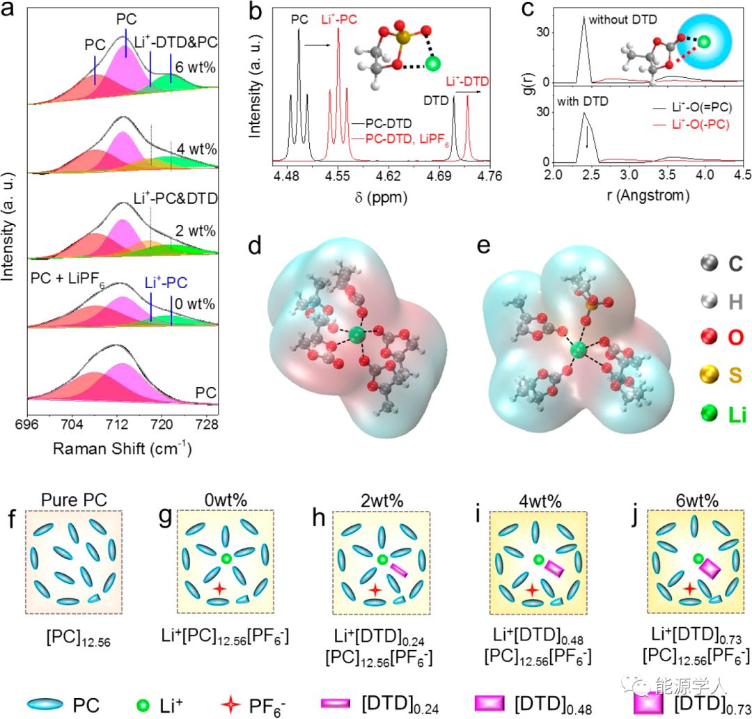 通過對含有不同DTD濃度的PC基電解液進(jìn)行拉曼光譜分析,可以獲得對電解液配位化學(xué)的深入了解。首先,觀察到,一旦LiPF6鹽溶解,擬合峰出現(xiàn)在718和721 cm-1附近,該峰對應(yīng)于PC分子的不對稱環(huán)變形,數(shù)量減少并且移向更高的波數(shù);其歸因于Li+-PC團(tuán)簇的形成和電解液中游離PC分子(即Li+[PC]12.56[PF6-])的濃度降低。在將DTD添加到電解液中(低于6 wt%DTD)時,由于Li+團(tuán)簇(即Li+-PC&DTD)中Li+-DTD和Li+-PC的相互作用不同,因此Li+-PC的峰變寬了。DTD分子可以與Li+(即Li+[DTD]x[PC]12.56[PF-]6,x = 0,0.24,0.48,0.73)競爭配位。當(dāng)DTD濃度為6 wt%(即Li+[DTD]0.73[PC]12.56[PF6-])時,Li+團(tuán)簇和游離PC明顯分離。