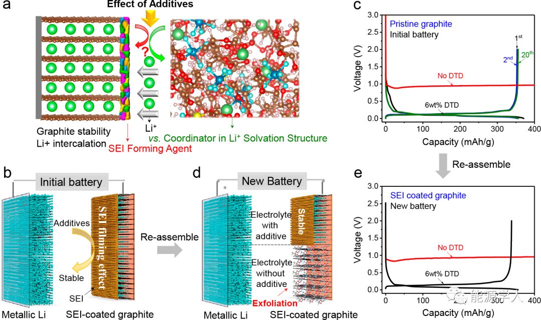 電解液添加劑對石墨負(fù)極穩(wěn)定性的影響有爭議的問題如圖1a所示。首先在石墨基鋰離子電池(即石墨與鋰)中研究了含有硫酸乙烯酯(DTD)添加劑的PC基電解液。可以看出,在PC基電解液中使用DTD后石墨的容量穩(wěn)定在353 mAh g-1,其中SEI可以在石墨表面上形成(圖1b),沒有持續(xù)的電解液還原和/或石墨剝離(圖1c)。將幾個循環(huán)后電池拆解,取出該SEI包覆的石墨并組裝新的電池。結(jié)果發(fā)現(xiàn)SEI包覆的石墨在含6% DTD的相同電解液中可以連續(xù)工作并有353 mAh g-1容量,但在不含DTD的電解液中卻立即失效。在沒有DTD添加劑的新電池中,SEI包覆的石墨(圖1e)在0.94 V左右均觀察到嚴(yán)重的電解液還原和石墨剝離現(xiàn)象。該結(jié)果表明,SEI層無法穩(wěn)定石墨以實現(xiàn)可逆的Li+脫嵌。這些結(jié)果證實了SEI抑制石墨剝離的能力取決于電解液中是否有足夠的DTD添加劑;影響石墨性能的關(guān)鍵因素(例如:Li+脫嵌入或Li+-溶劑共嵌)實際上是電解液的成分。