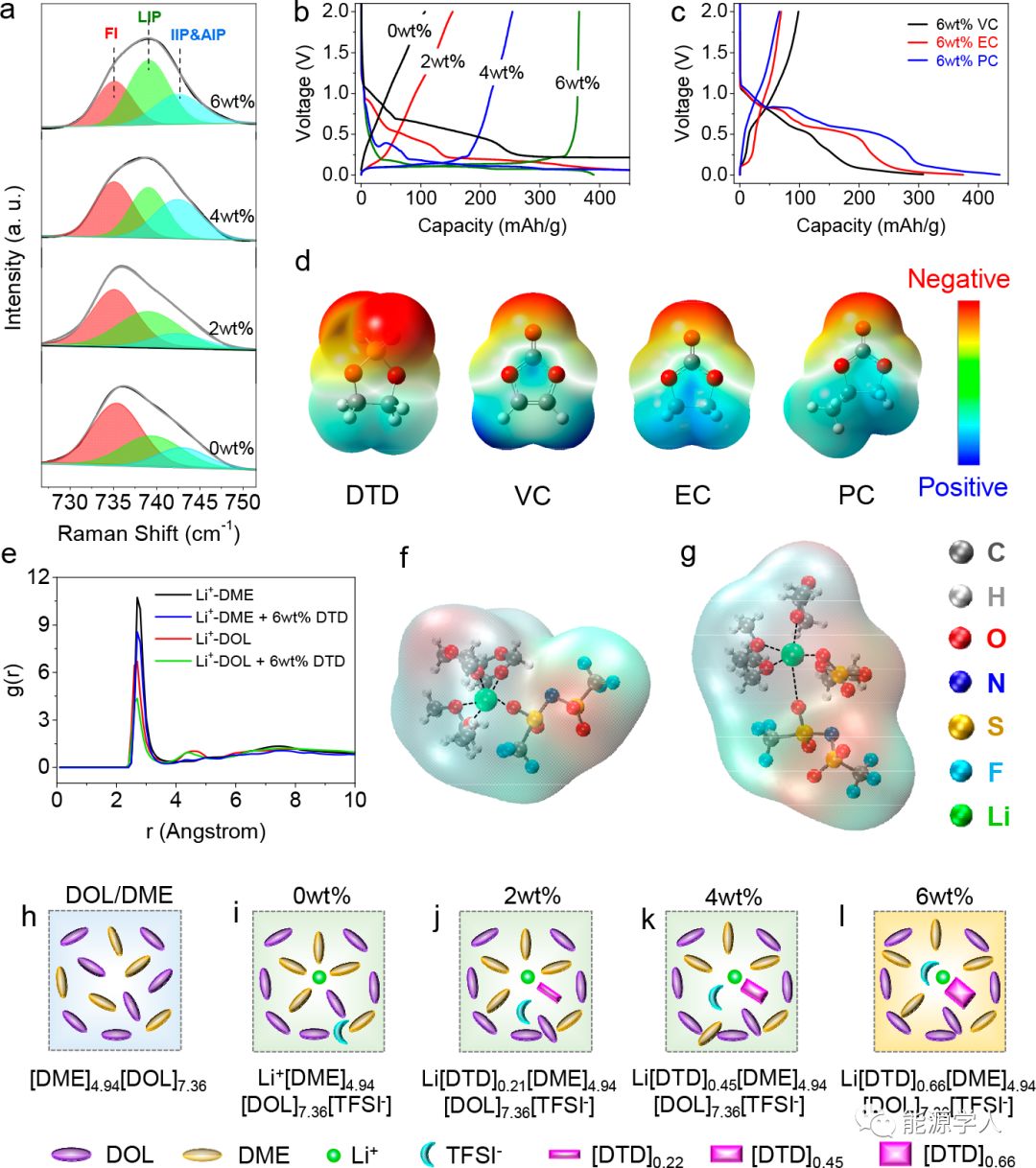 此外,使用弱配位添加劑(例如:VC、EC和PC)的醚基電解液在1.0-0.1 V電壓范圍內(nèi)具有更嚴(yán)重的電解液分解和Li+-溶劑嵌入石墨的現(xiàn)象(圖4c),這進(jìn)一步證實了添加劑協(xié)調(diào)能力的重要性(圖4d)。仿真模擬可以進(jìn)一步證實該結(jié)論,具體而言,當(dāng)將DTD添加劑添加到電解液中時,出現(xiàn)在Li+周圍的醚基溶劑的頻率顯著降低(圖4e)。圖4f,g清楚地表明乙醚溶劑可以被DTD取代,從而導(dǎo)致弱的Li+-溶劑相互作用。因此,圖4h-l進(jìn)一步顯示了DOL/DME,LiTFSI和不同量的DTD添加劑之間的分子相互作用的示意圖,以使Li+-溶劑相互作用的變化清晰可見。