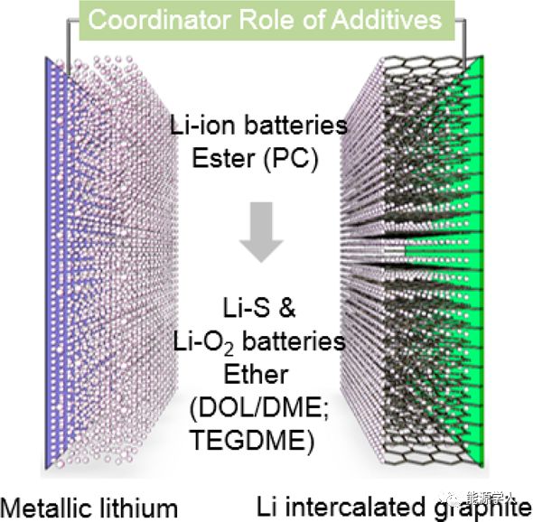 因此,在鋰離子、Li-S和Li-O2電池常用的電解液體系中,系統(tǒng)地證明了添加劑在不同種類電解液中的配位作用(圖6)。添加劑在碳酸酯和醚基電解液中的配位作用為優(yōu)化金屬離子電池使用不同溶劑(例如亞砜、砜、腈、磷或硅基溶劑)提供了一種新方法。