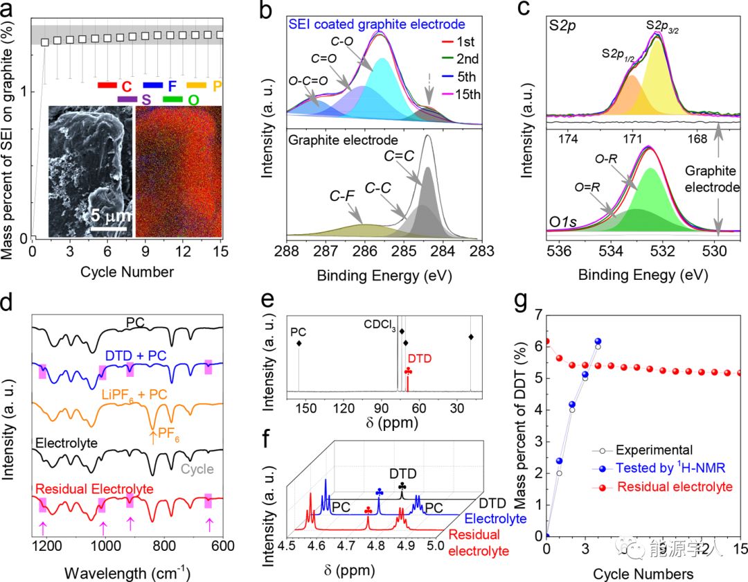在過去的20年中,許多添加劑(例如:碳酸亞乙烯酯(VC)、LiBOB、金屬離子、鈉鹽或鉀鹽、乙烯基亞硫酸乙烯酯(VES)、1,3-丙烯磺內(nèi)酯、三氧化硫、磷酸酯、三(三甲基三甲硅烷基)亞磷酸酯和呋喃酮)通常用作SEI成膜劑,可保護(hù)石墨陽極,并確保石墨中可逆的Li+脫嵌。在本文中,作者發(fā)現(xiàn)重復(fù)充放電過程中添加劑(例如DTD)的消耗很有限。在初始循環(huán)中,SEI在石墨表面上快速形成,然而其重量、形態(tài)或組成沒有明顯變化(圖2a)。XPS分析進(jìn)一步證實了這種現(xiàn)象。與原始狀態(tài)相比,圖2b, c中石墨電極的C 1s,S 2p和O 1s峰的強度、形狀和擬合顯示出在第一個循環(huán)中與原始狀態(tài)相比有明顯的變化,表明了在第一個循環(huán)中SEI的形成,此后變化很小。