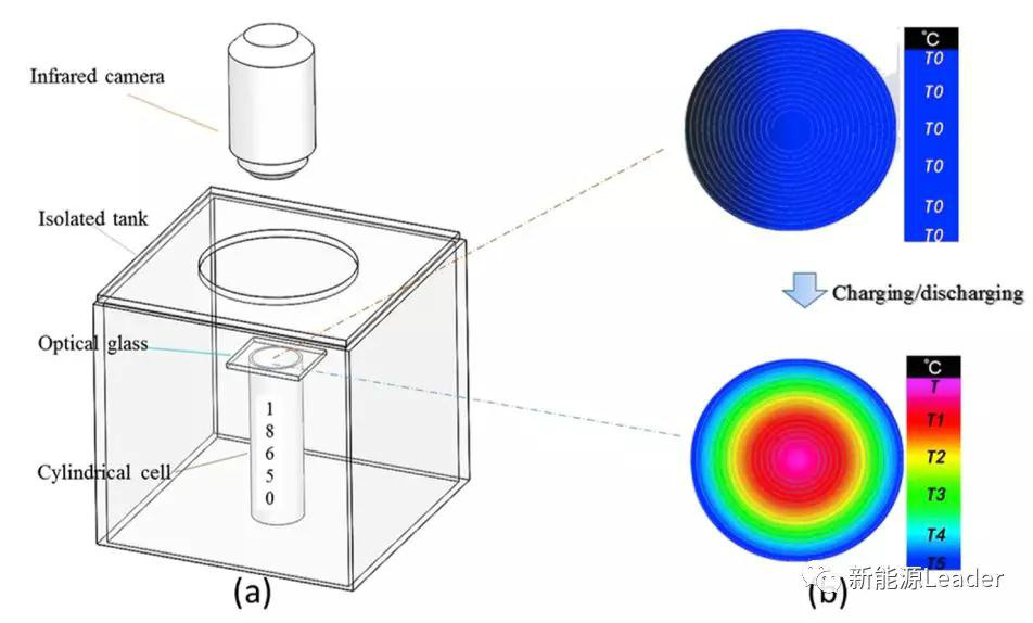 試驗中作者采用18650電池作為研究對象,該電池的正極為NCM,負極為石墨材料,隔膜為PP/PE/PP三層復合隔膜,電解液為1M LiPF6(EC:DMC=1:1),為了方便對電池內部的溫度梯度進行觀測,作者將電池上蓋移除,并覆蓋一層光學玻璃,方便對電池內部的溫度進行觀測。整個試驗是在下圖所示的裝置內部進行的,試驗過程中作者首先以0.046A的電流將電池充電到4.2V,然后分別以0.2C、0.5C、1.0C和3C倍率將電池放電到2.5V,通過電池上部的紅外相機來觀測鋰離子電池內部的溫度變化。