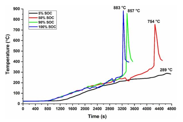 下圖為不同SoC的電池在上述的測試中電池表面溫度的變化,從圖中能夠看到90%和100%SoC的電池在55min左右時都出現了一個溫度的快速升高,最高溫度分別達到了857℃和883℃,而5%SoC的電池在整個試驗中沒有出現溫度劇烈升高的現象,最高溫度也僅為289℃,遠低于其他電池。