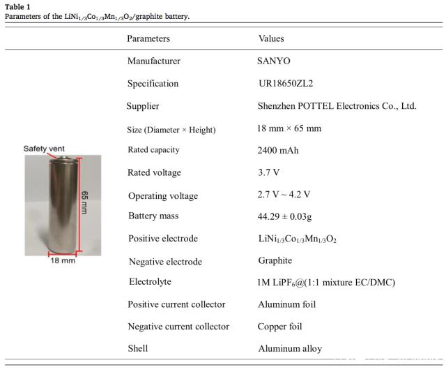 試驗中采用的鋰離子電池為18650電池,電池的基本信息如上表所示,電池的正極為NCM111材料,負極為石墨材料,額定容量2400mAh,分別測試該電池在5%、50%、90%和100%SoC狀態下的熱穩定性。