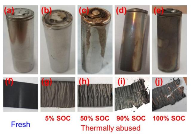 下圖為新電池和不同SoC狀態熱濫用后電池的外觀,從圖中能夠看到所有的電池都是從防爆閥泄壓,殼體并未被破壞。對于5%和50%SoC的電池能夠從上蓋處觀察到電解液泄漏的痕跡,而90%和100%SoC的電池則在上蓋處觀察到了燃燒的痕跡。對熱濫用測試后的電池進行解剖后發現,5%和50%SoC的電池的活性物質仍然牢固的粘結在集流體上,隔膜出現了嚴重的收縮,但是沒有被完全燒毀。而對于90%和100%SoC的電池在熱濫用后電極則完全被破壞,活性物質從集流體表面剝落,隔膜也被完全燒毀。