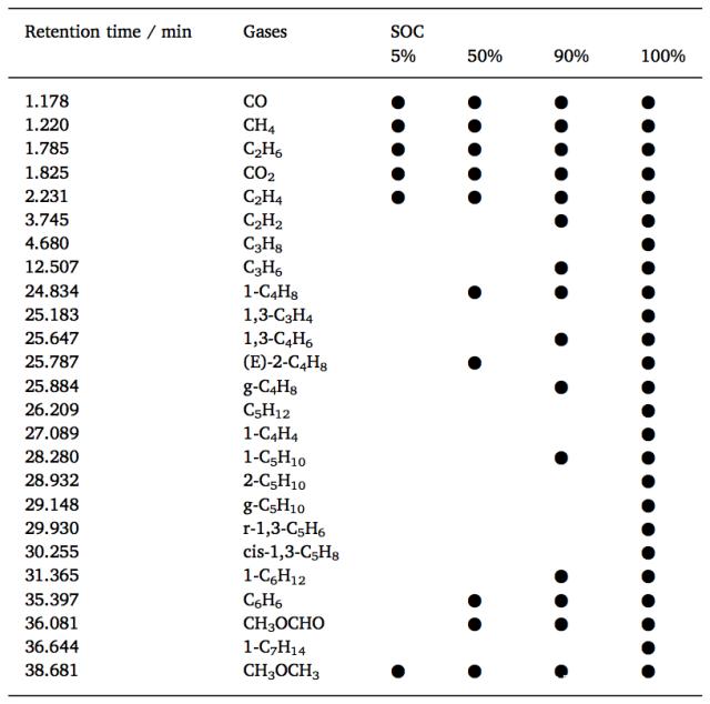 下表為在電池發生熱失控過程中產生的氣體的成分,從圖中能夠看到隨著電池SoC的升高,電池產生的氣體的種類也在增多,5%、50%、90%和100%SoC的電池在這一過程中產生的氣體種類分別為6、10、15和25種。